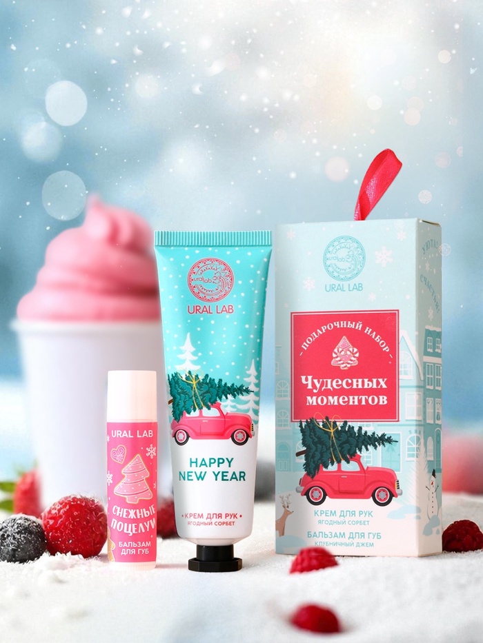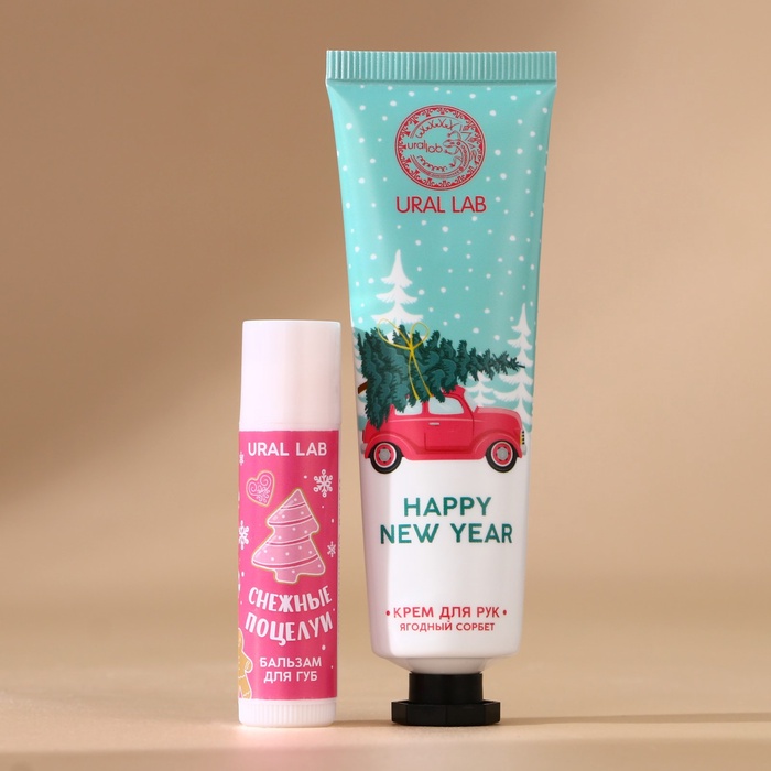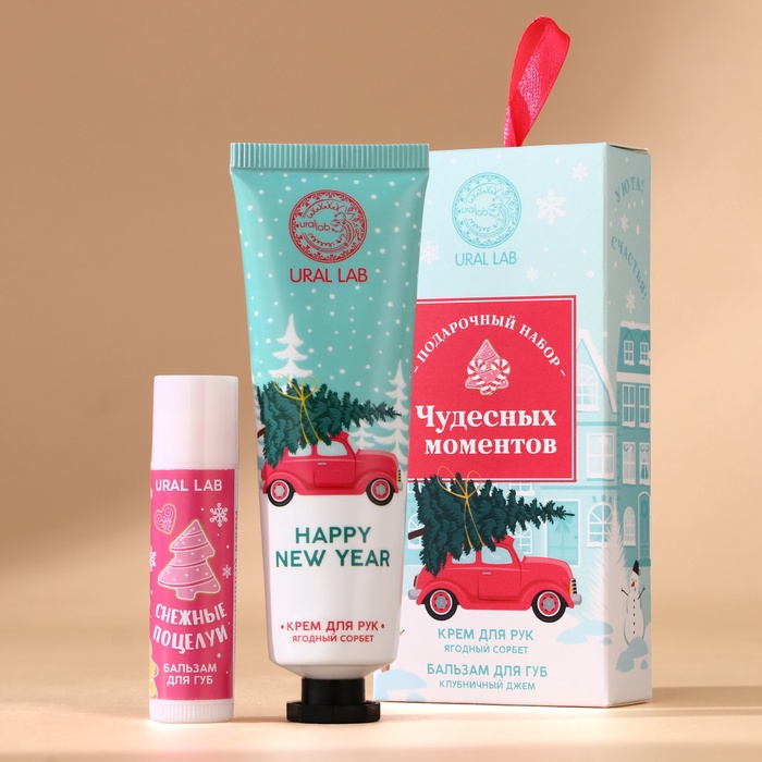 Новогодний подарочный набор косметики женских «Чудесных моментов»: крем для рук 30 мл и бальзам для губ 10 г, URAL LAB