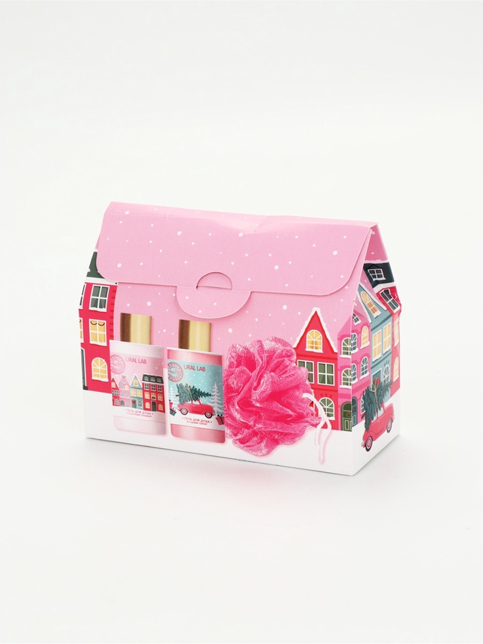 Составляющие набора: Пена для ванн, Гель для душа, Мочалка