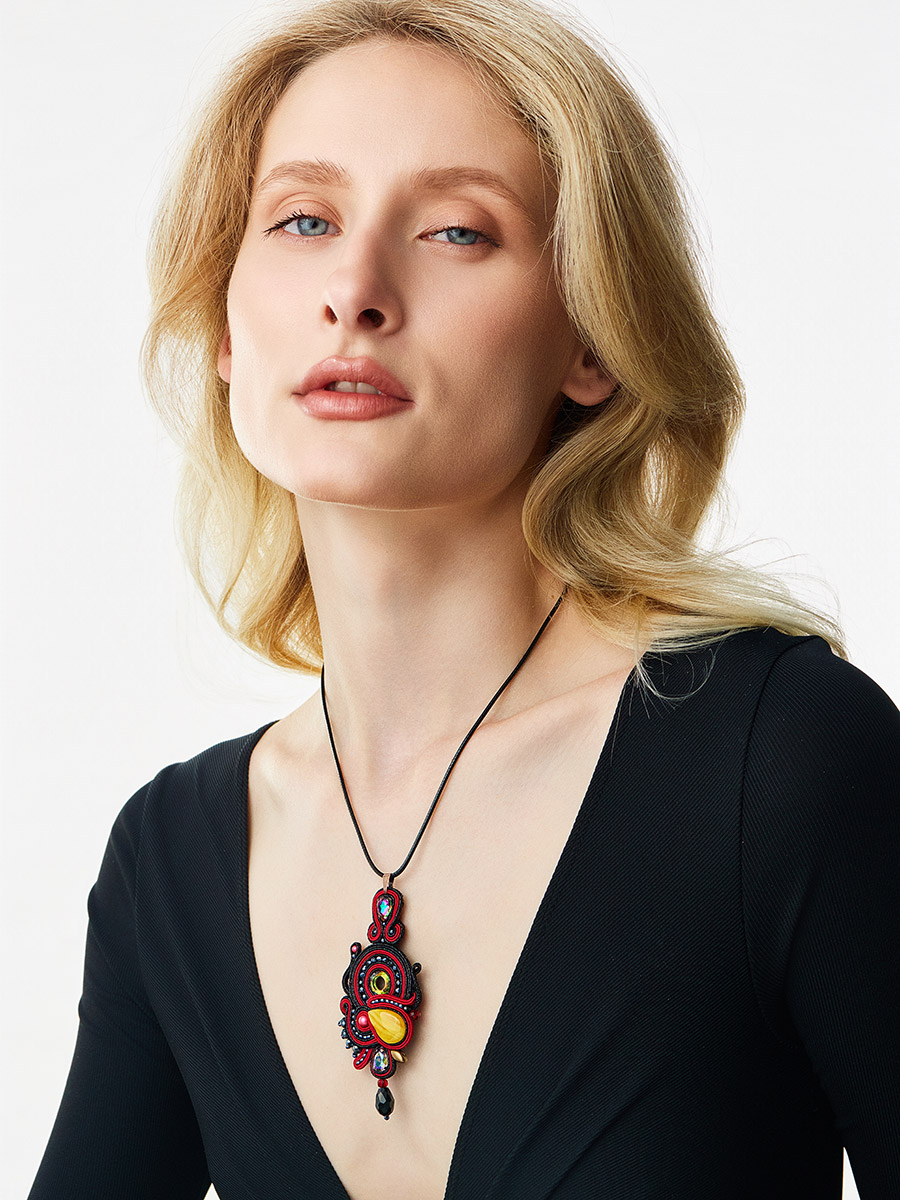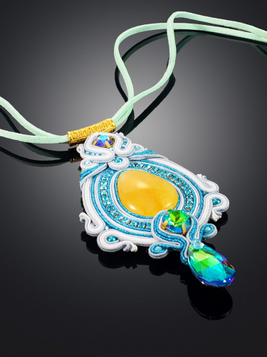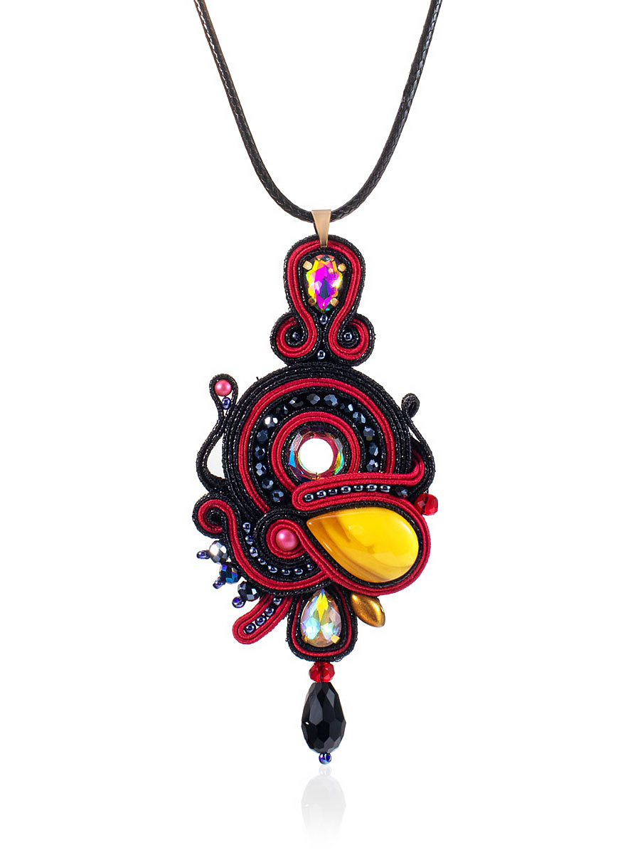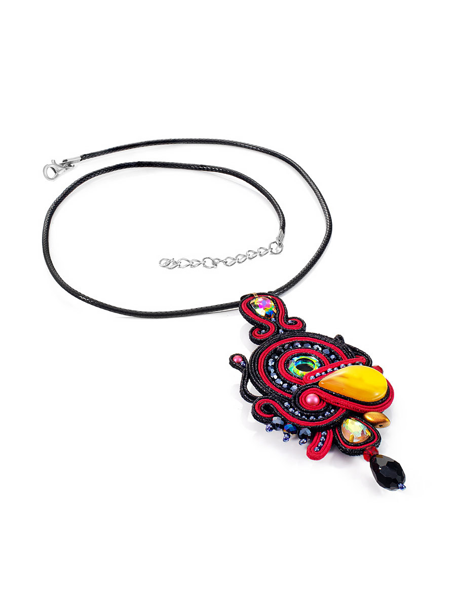 Яркая плетёная подвеска на шнурке, украшенная медовым янтарём и кристаллами «Индия»