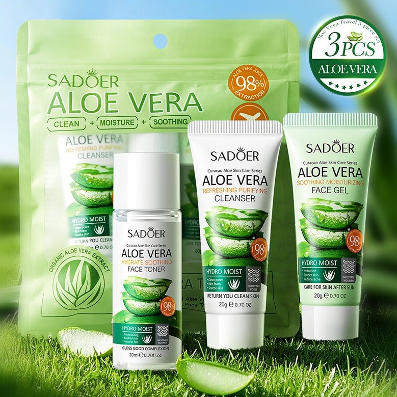 Дорожный набор из 3 средств для лица с экстрактом Алоэ Sadoer (Пенка + Тонер + Гель), 20*20*20 гр.