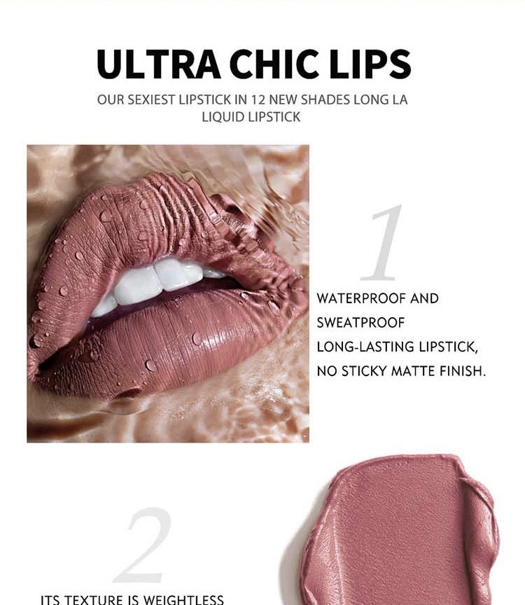 Формула насыщенная антиоксидантами и эксклюзивным увлажняющим комплексом, не сушит нежную кожу губ. Невесомая текстура блеска наносится тонким слоем, спустя короткое время приобретает насыщенный оттенок, матовый финиш и невероятную стойкость. Вы даже можете забыть, что ваши губы накрашены!