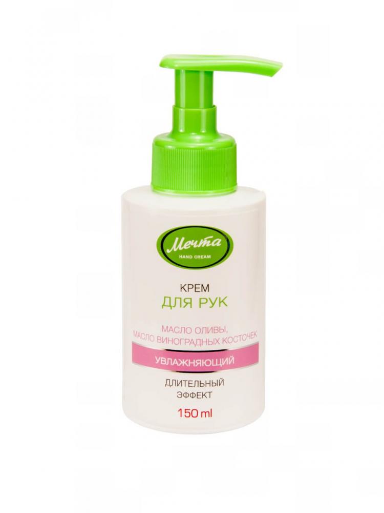 Крем для рук увлажняющий «Мечта» идеальное средство для рук: он активно увлажняет кожу, разглаживает морщины, устраняет последствия обезвоженности, шелушение и раздражения. Содержание в креме ценных растительных масел оливы и виноградной косточки обеспечивает вашим рукам полноценный смягчающий и увлажняющий уход в течение дня.