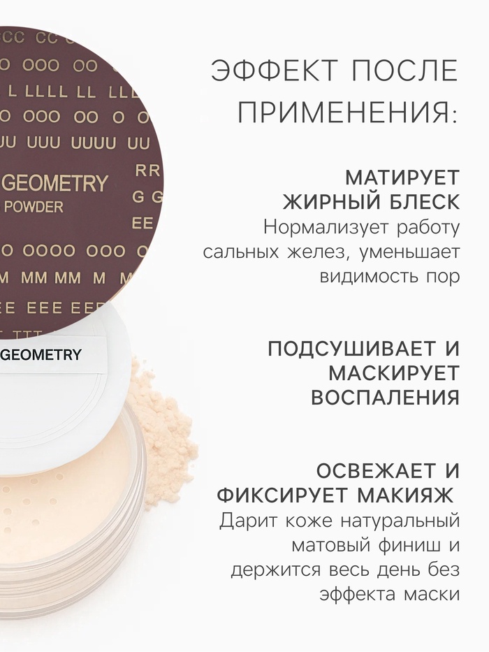 Легкая, шелковистая текстура пудры легко распределяется, не забивает поры и не сушит кожу. Она надежно фиксирует макияж, контролирует жирный блеск и делает кожу визуально более гладкой и свежей. Благодаря мелкому помолу, пудра практически незаметна на лице — только результат, никакого утяжеления.