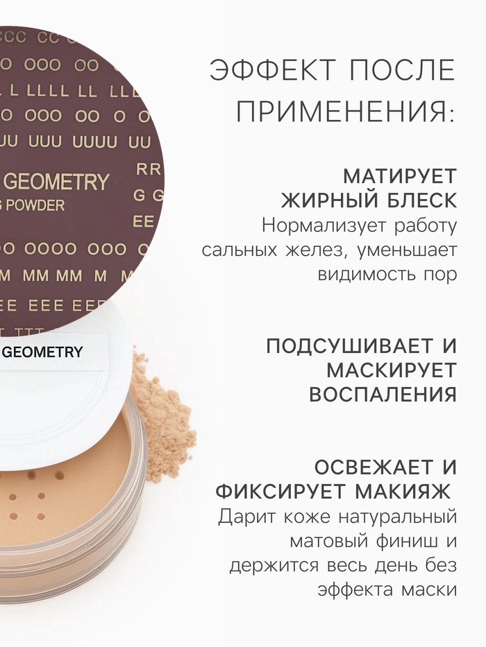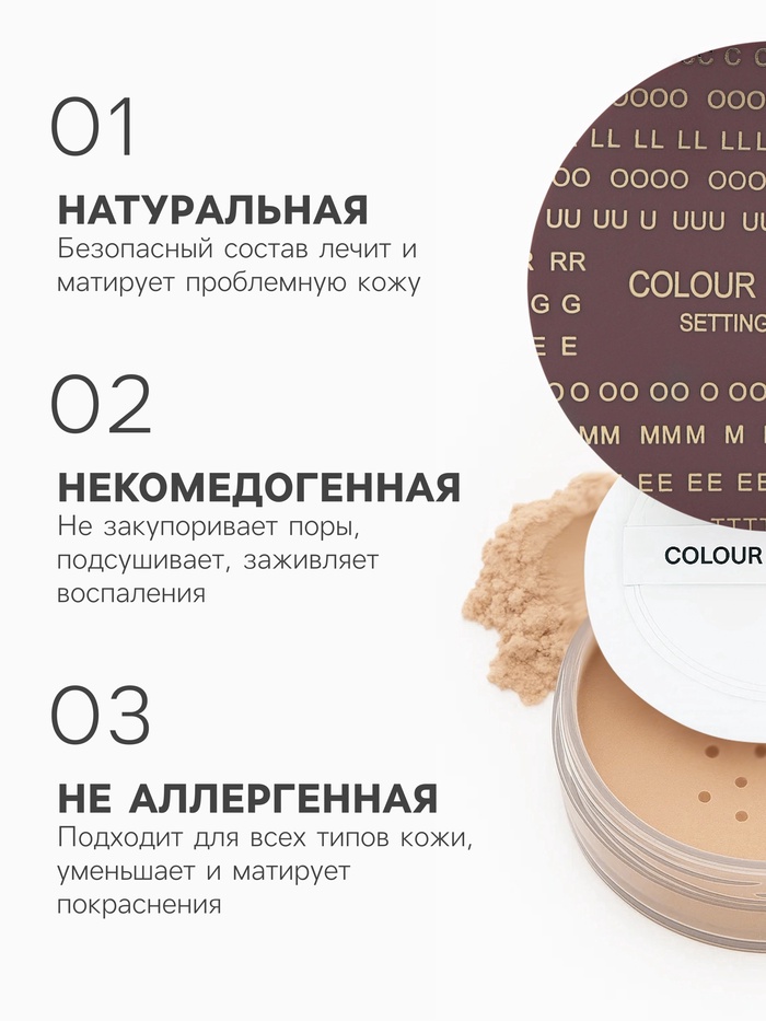 Легкая, воздушная текстура пудры отлично распределяется по коже, контролирует жирный блеск и фиксирует макияж на весь день. Благодаря тонкому помолу средство не забивает поры и не подчеркивает текстуру кожи, сохраняя ощущение комфорта.