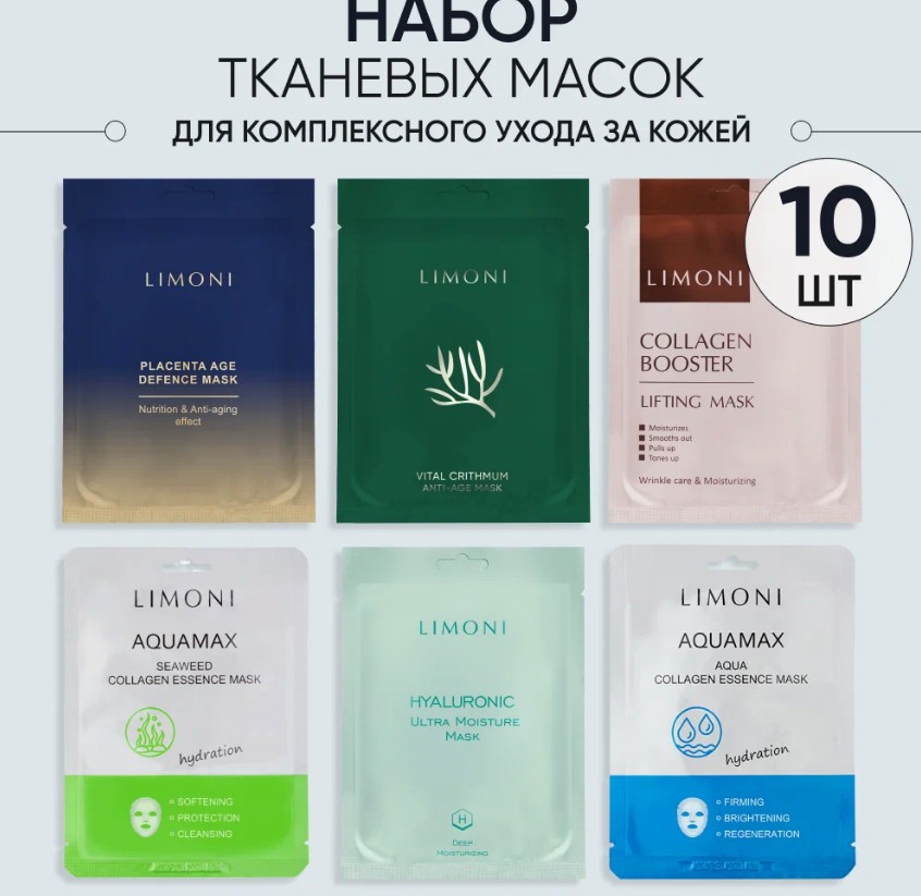 LIMONI Набор масок Ассорти(10шт) №5 (Crithmum 2/Placenta2/ Hyaluronic2/ Collagen2/ Syn-Ake2),