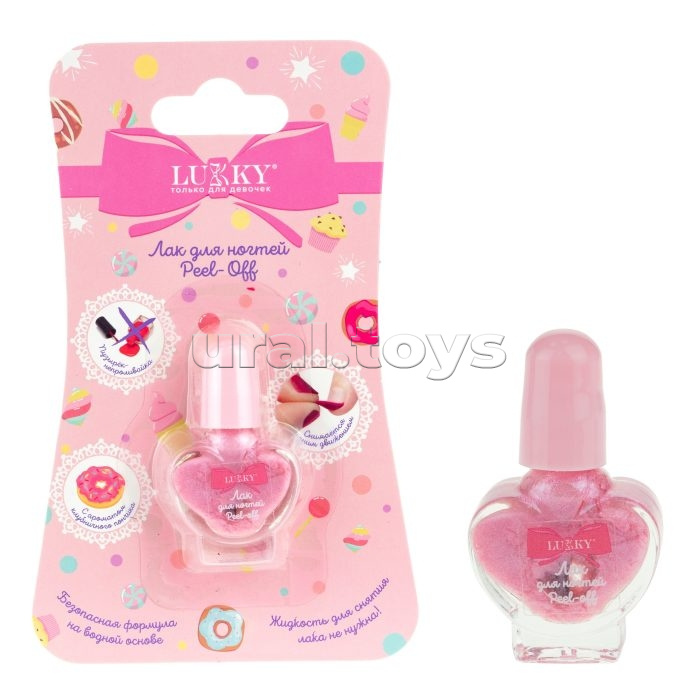 Lukky Лак для ногтей peel-off перламутровый с ароматом клубничного пончика, флакон в виде сердечка 5 мл, цвет светло розово-сиреневый, блистер