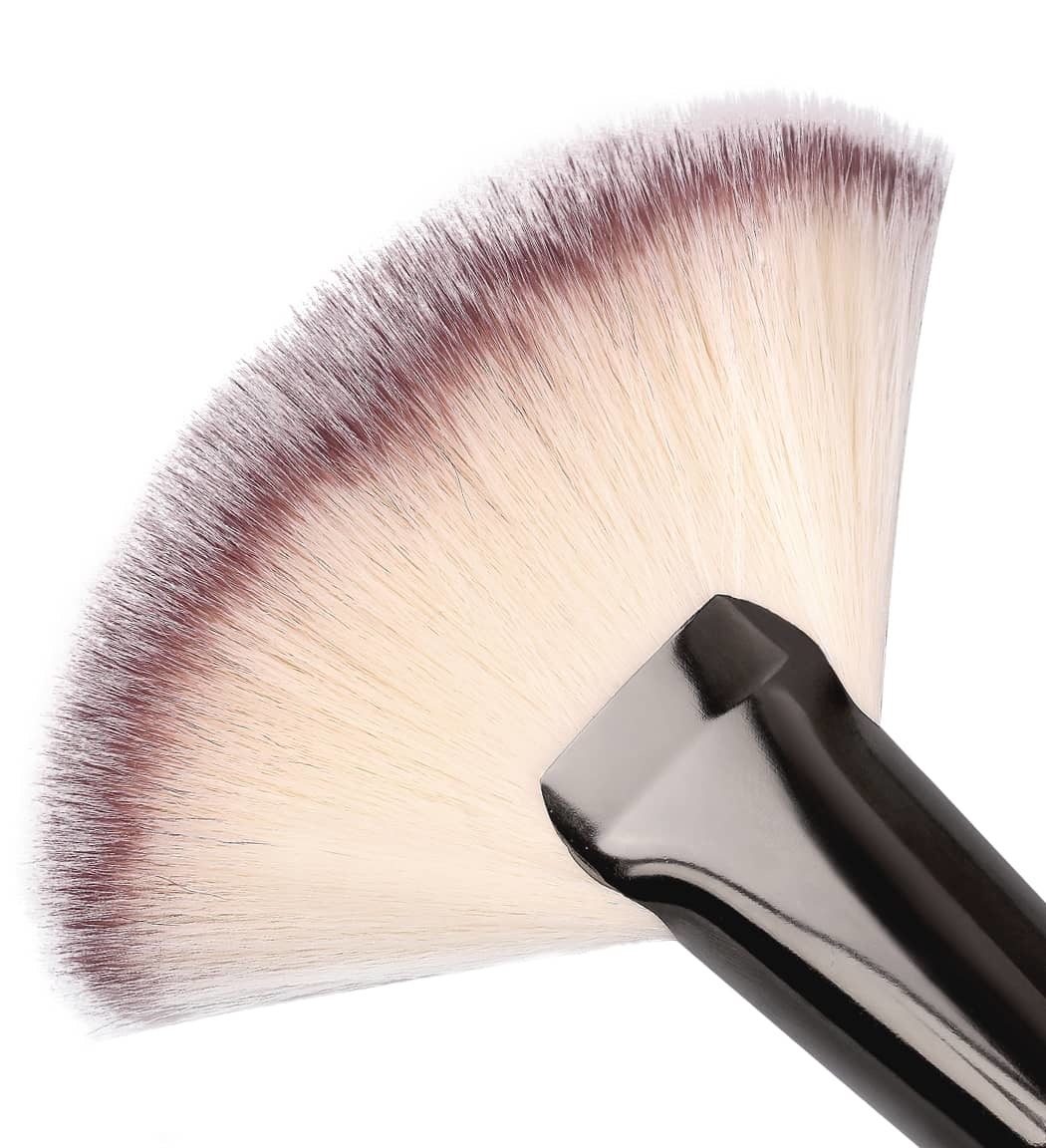 Веерная кисть незаменима для припудривания зоны декольте и удаления излишков косметики с лица (например, осыпавшиеся тени под глазами), не повредив при этом макияж.