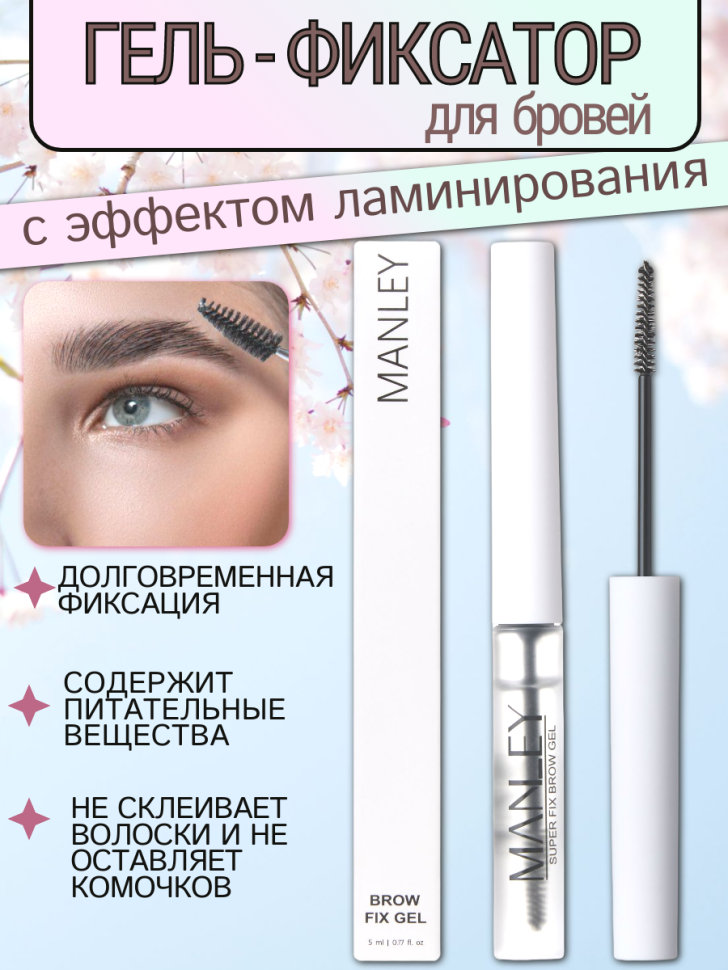 Профессиональный гель MANLEY для надежной фиксации бровей, мгновенно создающий эффект укладки и ламинирования на весь день одним нанесением. Прозрачная формула средства обеспечивает стойкость до снятия макияжа, без налета и комочков. Тонкая коническая щеточка распределяет состав, охватывая каждый волосок, упрощая стайлинг даже самых непослушных бровок. Гель предоставляет бережный уход благодаря составу с пантенолом и кератином, питая и укрепляя, увлажняет кожу, без ощущения тяжести, смывается водой, сохраняя здоровый и увлажненный вид. Красота и ухоженные брови за 1 минуту.