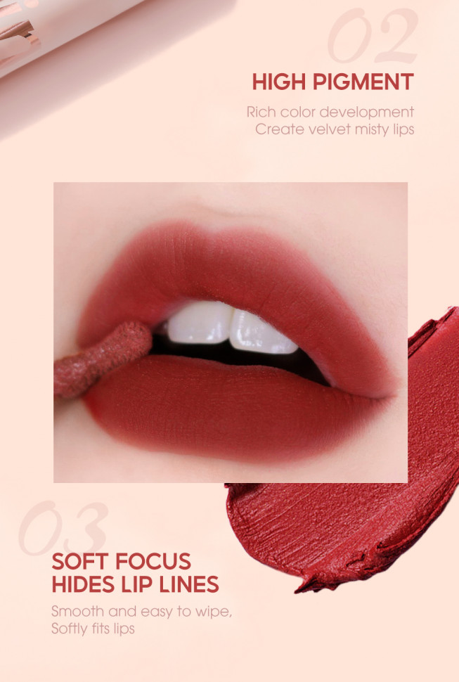 O.TWO.O SHINE Series 8 Colors Lip Mud Soft Velvet Matte Lipstick — это инновационная бархатная матовая помада-мусс, представленная в коллекции из 8 уникальных оттенков. Благодаря своей особой "грязевой" текстуре, она обеспечивает невероятно мягкое и комфортное нанесение, создавая при этом стойкий и насыщенный цвет.