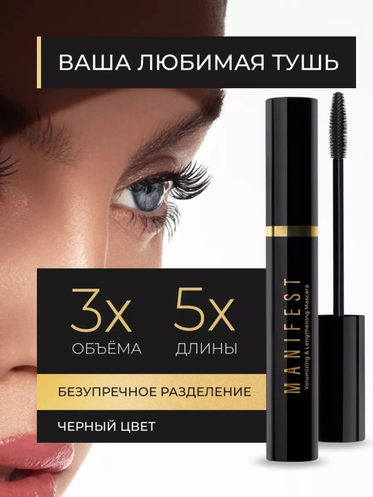 Черная тушь для ресниц с эффектом объема и удлинения Manifest мгновенно делает ресницы более густыми и выразительными. Благодаря насыщенной кремовой текстуре тушь легко наносится и отлично наслаивается, обеспечивая ресницам угольно-черный цвет и суперобъем. Эластичная щеточка туши для ресниц равномерно окрашивает волоски разной длины и жесткости, заметно приподнимает и придает им соблазнительный изгиб. Объемная удлиняющая тушь для ресниц не склеивает ресницы, не оставляет комочков и не осыпается после высыхания – с ней макияж легко продержится до 8-10 часов.​