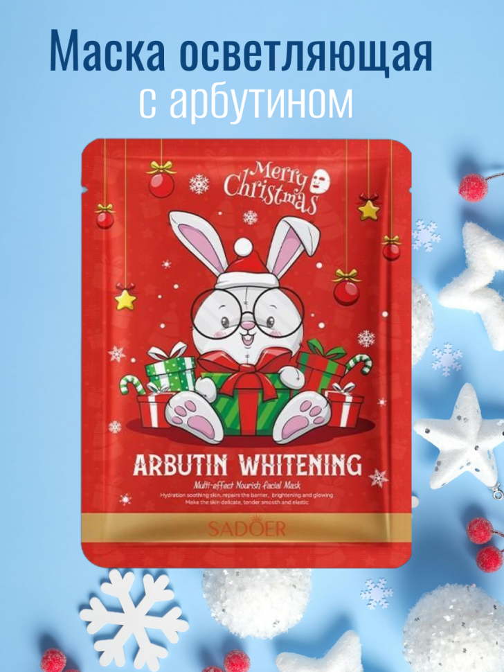 Новогодняя тканевая увлажняющая маска для лица с арбутином – это идеальное средство для ухода за кожей в праздничный сезон. Арбутин добывают из натуральных растений, он мягкий и безвредный для кожи; арбутин подавляет активность фермента комплексиназы в организме и снижает выработку меланина, тем самым обесцвечивая кожу и избавляя ее от веснушек! Арбутин также повышает антиоксидантный фактор кожи, избавляет от старения и повышает эластичность кожи!