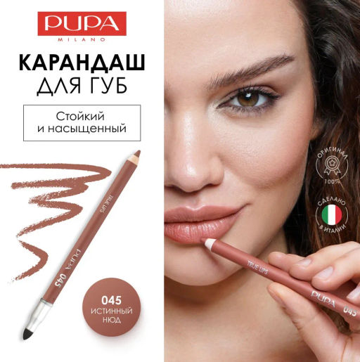 Карандаш для губ PUPA TRUE LIPS тон 045 истинный нюд — это профессиональное косметическое средство для контуринга и создания идеальной формы губ. Он делает на них акцент, хотя может также при необходимости скрыть недостатки. Стойкий карандаш, который не смазывается в течение дня, не подведет девушку в любой ситуации. Он также представлен в гелевой форме, которая легко наносится на губы, не сушит кожу и придает им матовый эффект. Пользоваться им на удивление удобно, что могли оценить уже многие девушки. Для этого достаточно нанести несколько штрихов или обвести по контуру, в зависимости от требуемого эффекта. Матовый карандаш для губ может быть использован как самостоятельный продукт для губ, так и как база для помады, улучшая ее стойкость и интенсивность цвета. Также с уверенностью можно сказать, что карандаш помада для губ — это незаменимый элемент в вашей косметичке, который поможет создать идеальный контур губ любого оттенка, подходит для какого угодно повода и мероприятия. Органичная часть коллекции True Lips, которая предлагает широкий выбор карандашей и помад для губ разных оттенков. Таким образом, если вы ищете профессиональный, стойкий и удобный в использовании карандашь для губ, то эта покупка станет просто отличным выбором. Гелевый карандаш для губ представлен в нескольких оттенках, соответствующих любому типу кожи губ, и гарантированно сделает вашу улыбку еще ярче и привлекательнее. Не вызывает аллергии.