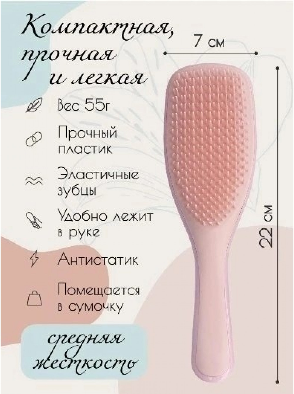 Расческа пластиковая массажная женская для волос всех типов: густых. длинных. объемных. тонких. ломких. ослабленных. спутанных. влажных. нормальных. прямых. кудрявых. вьющихся. коротких. наращённых. Прежде всего это расческа. которая заботится о красоте и здоровье Ваших волос. Прочная - корпус изготовлен из качественного abc пластика. Легкая - вес 55 г. Удобная - эргономичная ручка расчески хорошо сидит в руке. не выскальзывая во время расчесывания и укладки. Стильная - цвета и форма расчески великолепны. Двойные зубчики расчески предназначены для деликатного и быстрого распутывания запутанных волос: длинные - разделяют на локоны. короткие - расчесывают тонкие пряди. Рельеф зубчиков имеет анатомический изгиб по форме головы. что позволяет большему количеству зубчиков одновременно касаться кожи. а значит лучше массировать и расправлять больше волос за один проход. Зубчики изготовлены из гипоаллергенного материала ТРЕЕ. обладают достаточной эластичностью. что бы расчесывать и при этом не повреждать кожу и волосяные фолликулы. При регулярном использовании массажной расчески улучшается кровообращение. В результате луковицам волос поступает большее количество питательных веществ. что уменьшает выпадение и стимулирует рост волос. Аксессуар не боится воды - легко справляется с мокрыми волосами. а значит вы сможете использовать её и в душе для мытья волос. и для распределения масок и бальзамов для восстановления и укрепления волос. За расческой легко ухаживать - достаточно промыть ее в мыльном растворе. После использования расчески. волосы приобретают здоровый вид и блеск. становясь гладкими и шелковистыми. Цвета расчесок доступных для покупки - нежный розовый. лиловый. мятный. голубой. Обратите внимание! -щетка массажная обладает средней жесткостью и не подходит людям с супер мега чувствительной кожей. Подходит детям от 1 года.