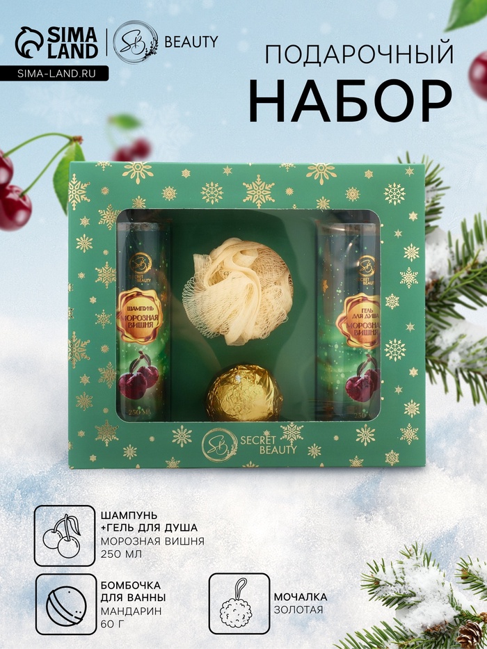Новогодний подарочный набор косметики SB BEAUTY, шампунь, гель для душа, бомбочка, мочалка, с ароматом вишни и мандарина