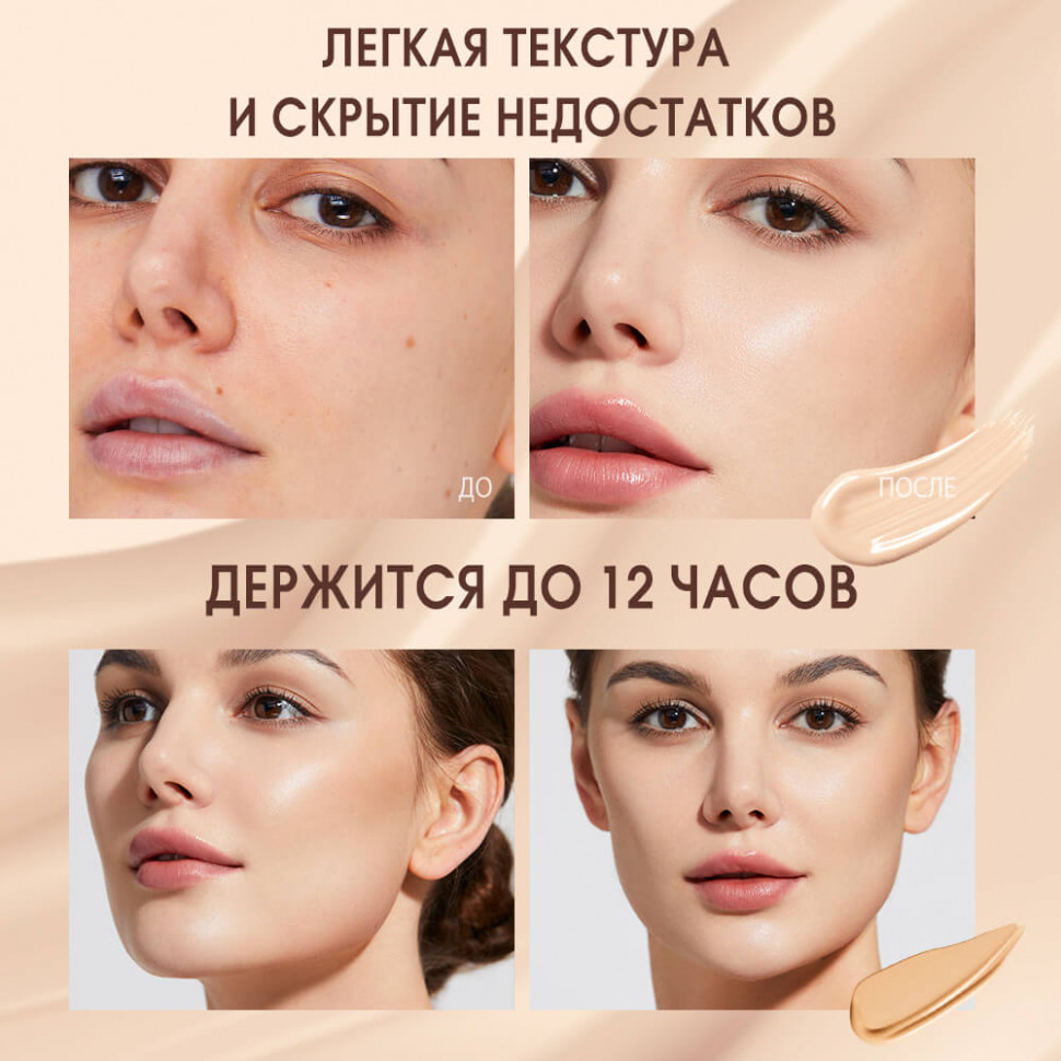 2. Полное покрытие: Плотное покрытие, при этом не создает эффекта маски и не образует темных пятен.