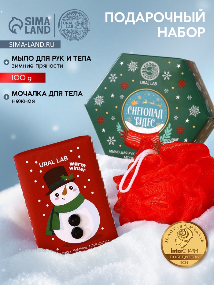 Подарочный набор новогодний женский «Снегопад чудес»: мыло для рук кусковое 100 г и мочалка для тела, URAL LAB