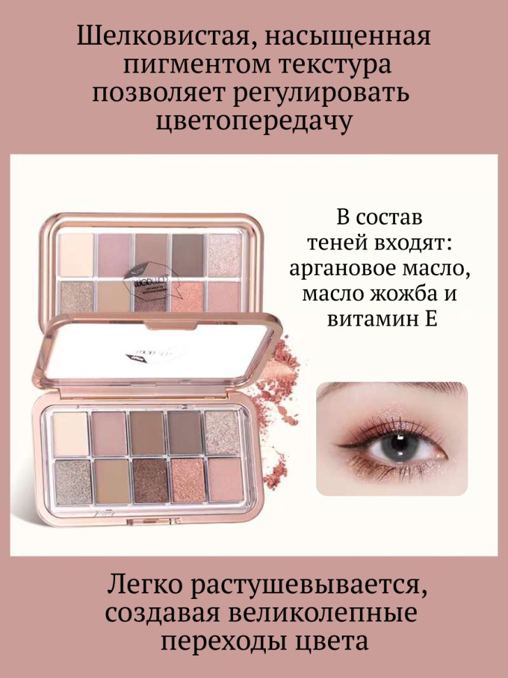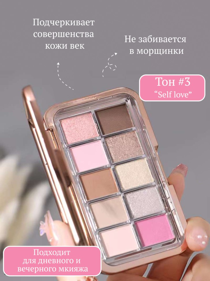 Нежная, шелковистая, практически невесомая текстура продукта комфортно наносится на веки и равномерно растушевывается. Десять универсальных оттенка, которые хорошо сочетаются между собой, позволяют создать как повседневный нюдовый макияж, так и изысканный вечерний мейкап. Тени имеют насыщенные пигменты и отлично держатся в течении дня. Не вызывают аллергии и не закупоривают поры. Поставляется набор в стильной и компактной упаковке, которая легко поместится в женской косметичке.​