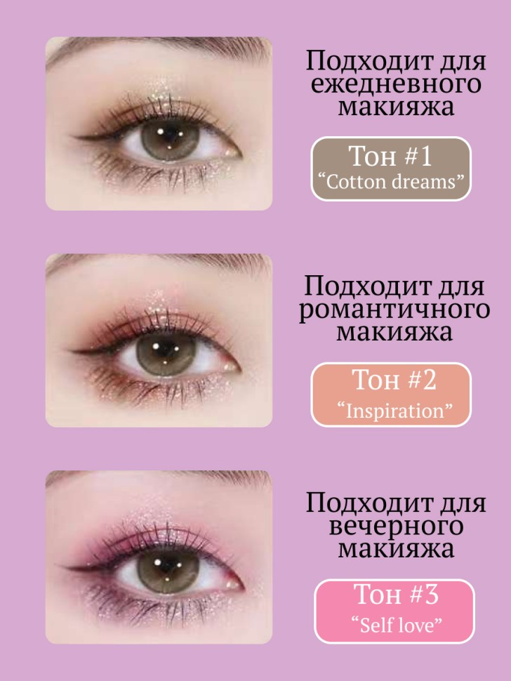 Нежная мягкая текстура средства легко распределяется, не забивается в морщинки и не подчеркивает несовершенства кожи век. Невесомые частицы жемчужного порошка в составе средства отражают и преломляют яркий свет с поверхности кожного покрова и придают нанесенному покрытию совершенный вид. Комплекс натуральных масел увлажняет и питает эпидермис, препятствует появлению признаков чрезмерной сухости.