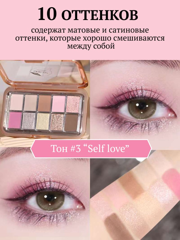 Нежная, шелковистая, практически невесомая текстура продукта комфортно наносится на веки и равномерно растушевывается. Десять универсальных оттенка, которые хорошо сочетаются между собой, позволяют создать как повседневный нюдовый макияж, так и изысканный вечерний мейкап. Тени имеют насыщенные пигменты и отлично держатся в течении дня. Не вызывают аллергии и не закупоривают поры. Поставляется набор в стильной и компактной упаковке, которая легко поместится в женской косметичке.
