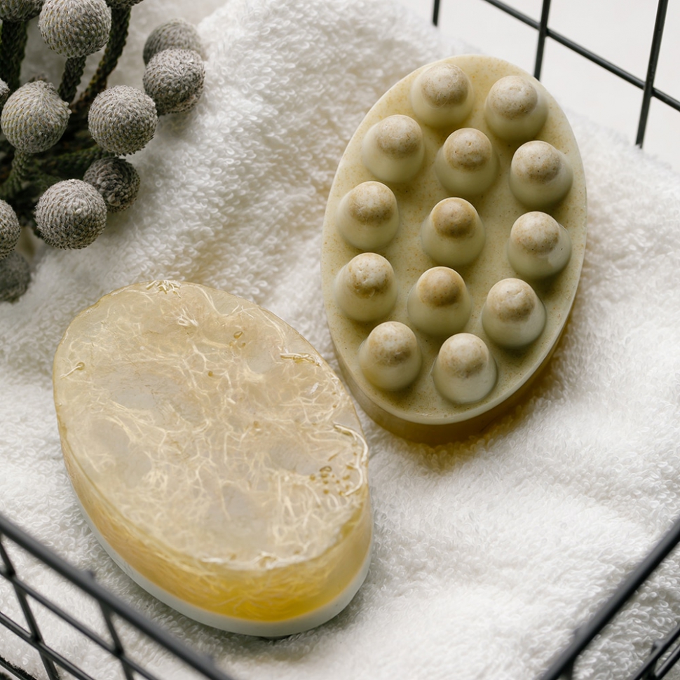 Зеленая глина, входящая в состав мыла, глубоко очищает поры, снимает воспаление, избавляет от шелушения. В состав мыла входит люфа (губка из одноименного растения), которая отлично скрабирует кожу, а также кедровое масло, которое бережно и эффективно увлажняет кожу. Мыло имеет удобную форму, благодаря которой можно прорабатывать проблемные зоны без использования специального массажера.