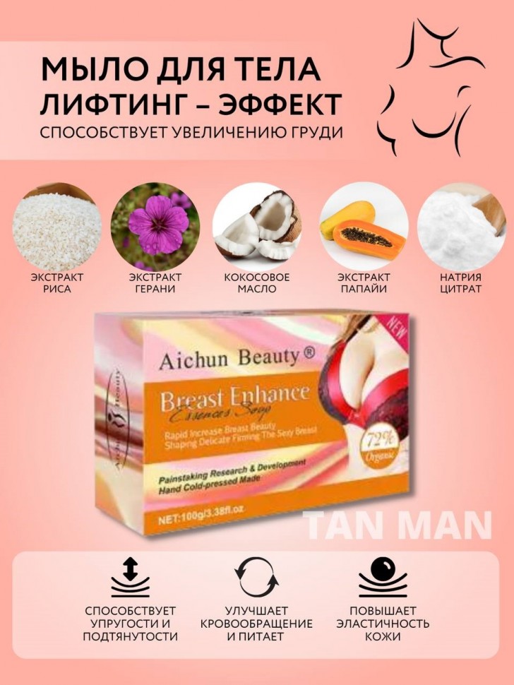 Уход для тела, созданный на основе технологий ручного холодного отжима. Быстрое увеличение груди. Красивая сексуальная форма. Деликатное укрепление. Деликатное увлажняющее Мыло на основе натуральных растительных эссенций; Кокосового масла, Папайи, Риса и экстракта Герани которые обладают сильной проницаемостью в ткани молочных желез, эффективно увеличивают грудь, обеспечивают питательными веществами, улучшают кровообращение, активизируют возможности развития и увеличения груди, делают грудь объемной и упругой, восстанавливают мягкость и естественную красоту!