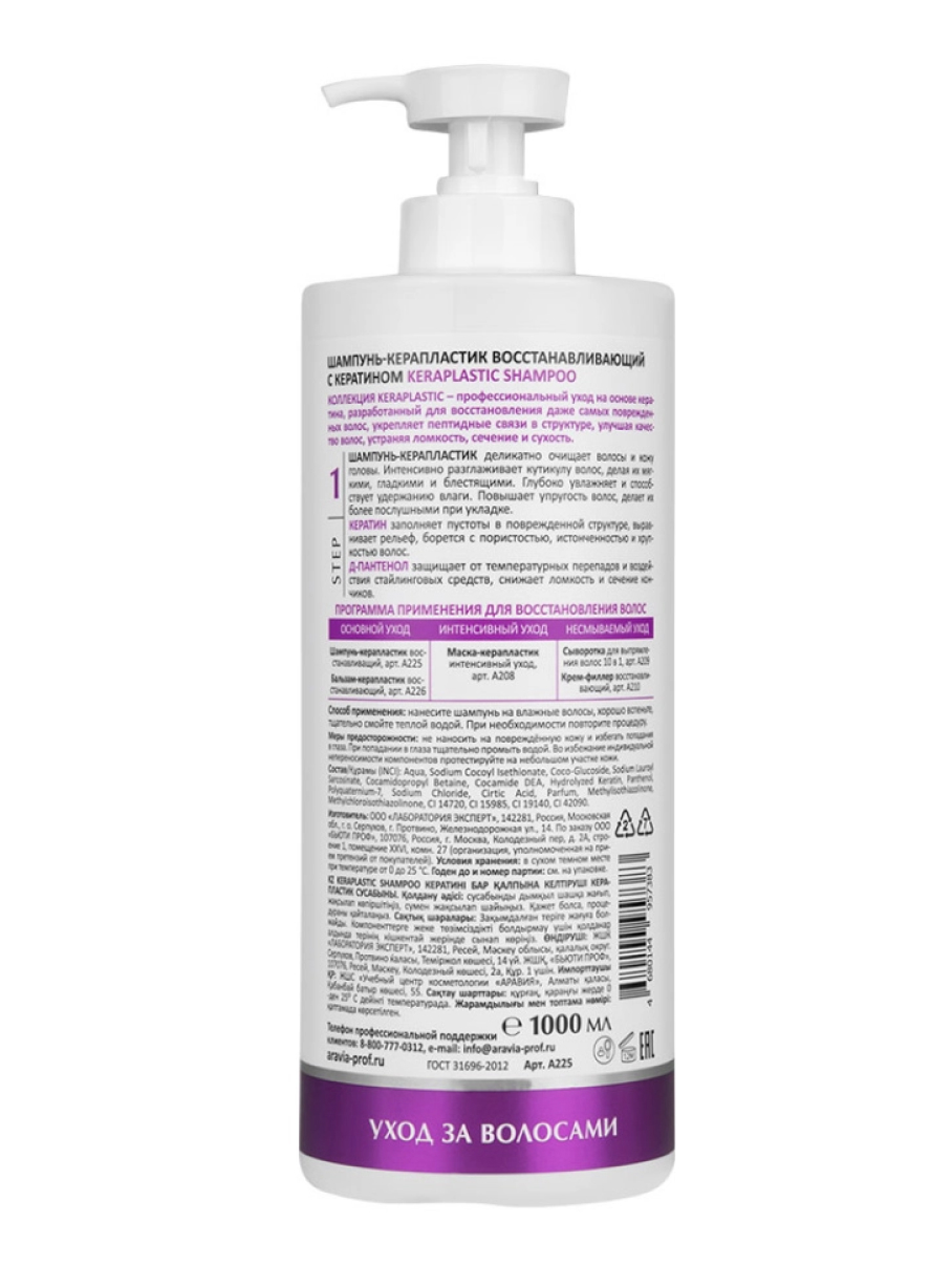 Aravia Laboratories Шампунь-керапластик восстанавливающий с кератином / Keraplastic Shampoo, 1000 мл