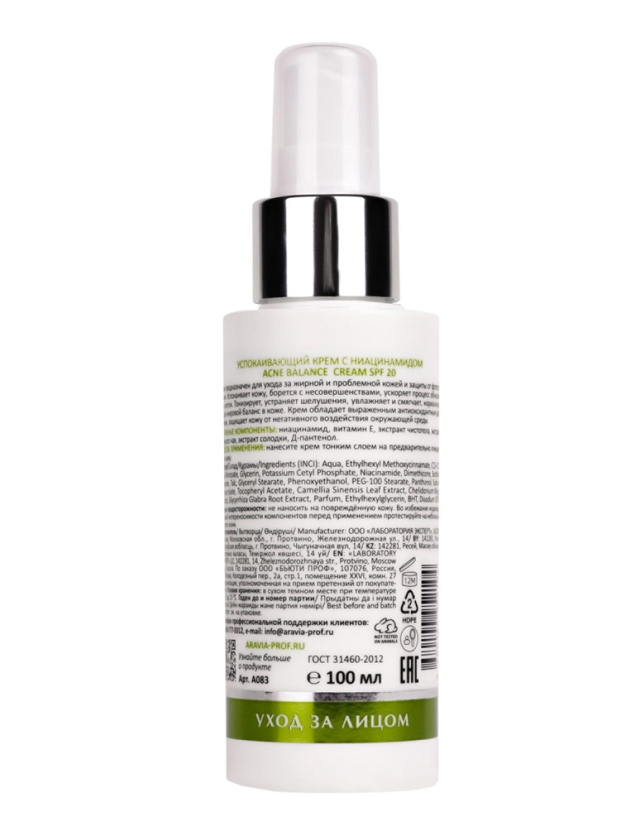 Aravia Laboratories Успокаивающий крем для лица с ниацинамидом / Acne Balance Cream SPF 20, 100 мл