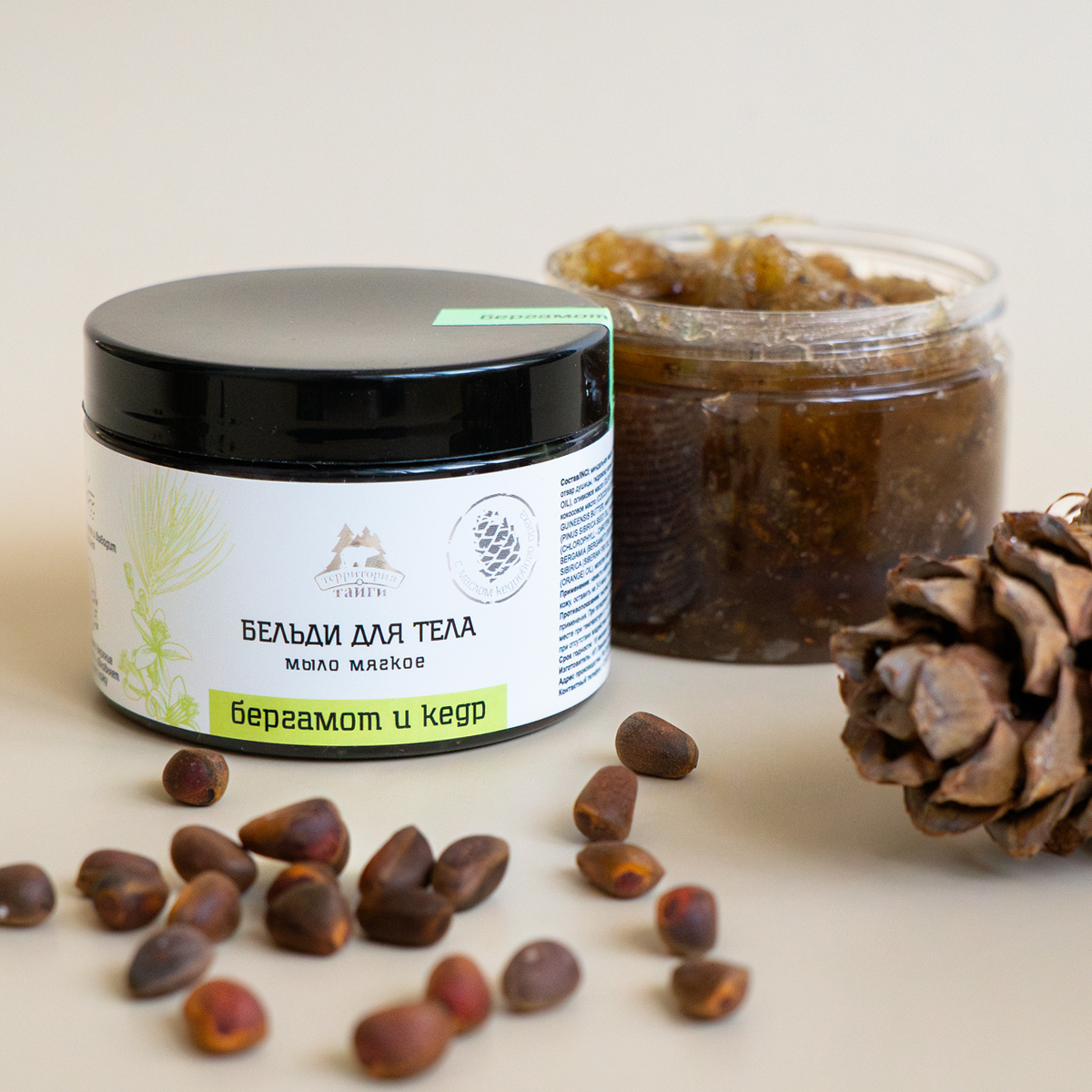 Состав: миндальное масло (PRUNUS AMYGDALUS DULCIS (SWEETALMOND) OIL),отвар душицы, гидроксид калия (POTASSIUMHYDROXIDE),соевое масло (GLYCINE SOJA OIL), оливковое масло (OLIVE OIL),касторовое масло (RICINUS COMMUNIS SEED OIL), кокосовое масло (COCOS NUCIFERA (COCONUT) OIL), пальмовое масло (LAEIS GUINEENSIS BUTTER), масло манго (MANGIFERA INDICA SEED OIL),масло кедрового ореха(PINUS SIBIRICA SEED OIL), глицерин (GLYCERIN), хлорофилл-каротиновая паста (CHLOROPHYLL - CAROTENE PASTE), эфирное масло бергамота (CITRUS AURANTIUM BERGAMIA (BERGAMOT) ESSENTIAL OIL), эфирное маслопихты сибирской (ABIES SIBIRICA (SIBERIAN FIR) OIL), эфирное масло апельсина (СITRUS AURANTUM DULCIS (ORANGE) OIL), молотая скорлупа кедрового ореха, молочная кислота (LACTIC ACID)_x000D_