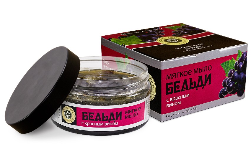 омыленные растительные масла (кокосовое, виноградных косточек, касторовое), подготовленная вода, кокоглюкозид; красное сухое вино, виноград темных сортов обезвоженный мелкодисперсный, экстракт винограда, глицерин, кислоты янтарная, лимонная, эфирные масла нероли, апельсина, пальмарозы, бензоат натрия.