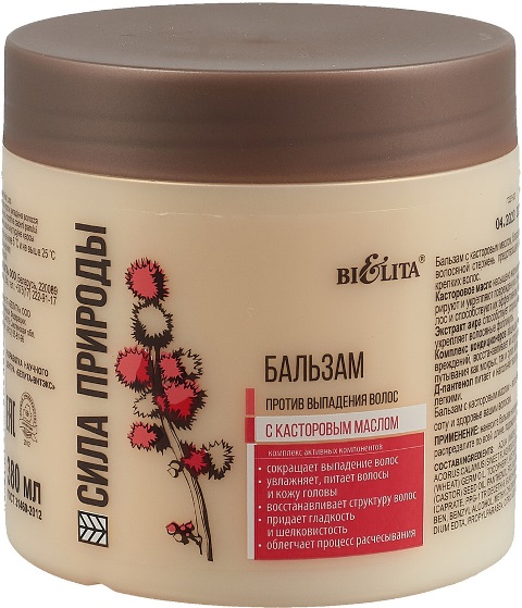 БЕЛИТА СИЛА ПРИРОДЫ бальзам с касторовым маслом, благодаря активным компонентам, восстанавливает волосяной стержень, предотвращает выпадение и стимулирует рост здоровых и крепких волос.Касторовое масло насыщено жирными кислотами, которые восстанавливают и укрепляют поврежденную структуру волос. Комплекс витаминов А и Е предотвращает выпадение волос и способствует их эффективному росту.Комплекс кондиционеров защищает волосы от механических и термических повреждений, восстанавливает их структуру, облегчает процесс расчесывания и распутывания как мокрых, так и сухих непослушных волос.Д-пантенол питает и наполняет волосы влагой, делая их послушными, гладкими и легкими.экстракт аира способствует сокращению выпадения волос, стимулирует их рост и укрепляет волосяные фолликулы.