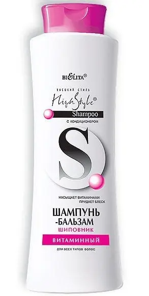 Это витаминизированный шампунь-бальзам для всех типов волос. Он содержит масло шиповника, комплекс витаминов А, В, Е, F, Н, которые ухаживают за волосами, питают их.