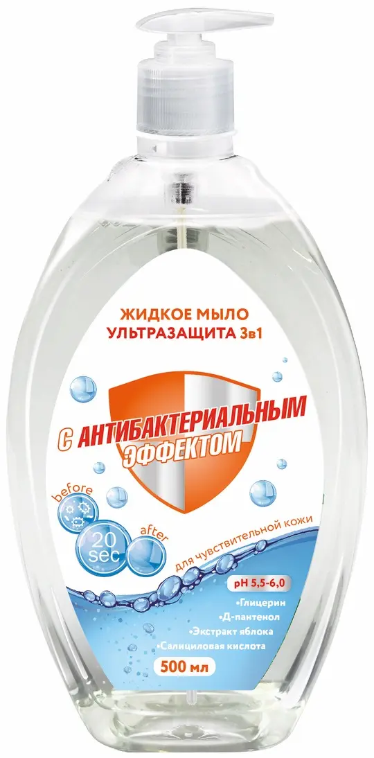 Жидкое мыло "Ультразащита 3в1" с антибактериальным эффектом содержит салициловую кислоту - антисептик способствует уменьшению салоотделения, ускоряет процесс отшелушивания ороговевших клеток, обладает противовоспалительными свойствами. В составе также есть Д-пантенол - обладает заживляющим действием, успокаивает кожу. Глицерин увлажняет и смягчает кожу рук. Подходит для сухой и чувствительной кожи. Не содержит красители, парабены, силиконовые масла, SLS!