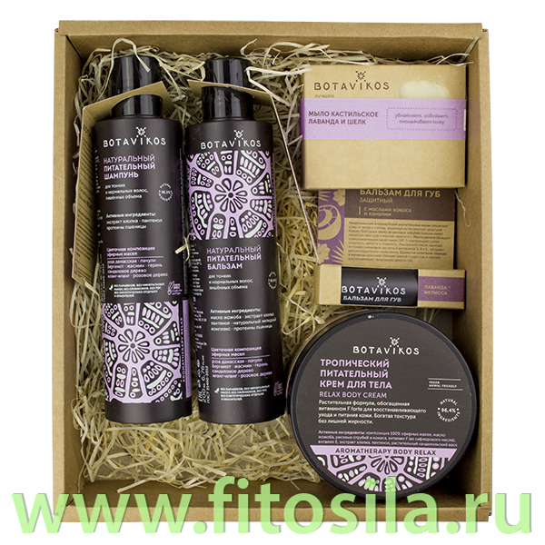 Набор подарочный ароматерапи Релакс большой: шампунь питат., бальзам. питат., питат. крем, бальзам д/губ защитный, мыло кастильское 201