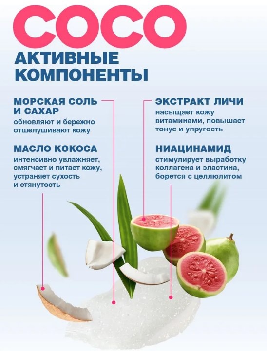 СоставНиацинамид, масло кокоса, экстракт личи, сахар, морская соль