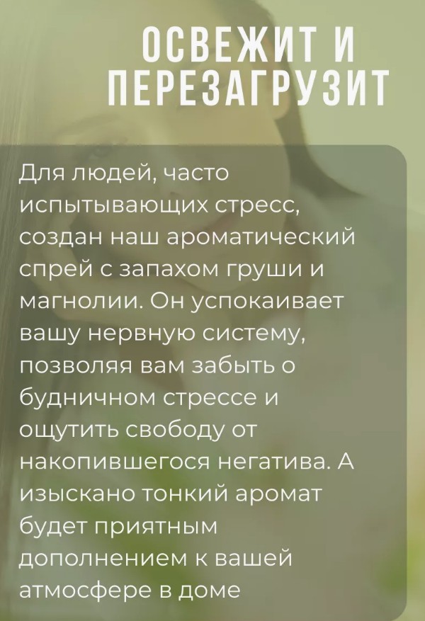 Сочетание аромата магнолии и английской груши наполняет воздух свежестью весеннего сада, создавая чувство безмятежности и покоя. Ароматизатор действует мягко, не вызывая раздражения или дискомфорта.