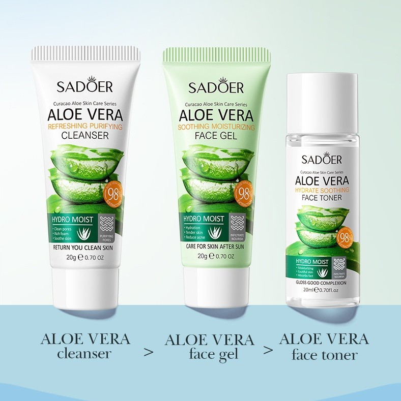 Дорожный набор из 3 средств для лица с экстрактом Алоэ Sadoer (Пенка + Тонер + Гель), 20*20*20 гр.