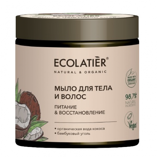 Мыло для тела и волос ECOLATIER®, благодаря активным компонентам в составе, деликатно очищает, тонизирует кожу, насыщает волосы влагой и питательными веществами. В результате применения мыла кожа становится бархатистой, увлажненной, а волосы мягкими и шелковистыми. Соответствует требованиям Vegan Society (Великобритания). Продукт содержит более 98% ингредиентов растительного происхождения. Органические ингредиенты: Органическое масло кокоса – ценный косметический компонент, богато насыщенными жирными кислотами, витаминами группы В и минералами. Усиливает барьерную функцию кожи, препятствует обезвоживанию. Эффективно увлажняет волосы, восстанавливает секущиеся кончики, защищает от негативных воздействий окружающей среды. Результатом применения косметики с маслом кокоса является бархатистая, мягкая и гладкая кожа и блестящие волосы. Состав: Aqua with infusion of: Organic Cocos Nucifera (Coconut) Liquid Endosperm (органическая Кокосовая вода), Vegetable Glycerin (растительного происхождения), Sodium Coco-Sulfate, Cocamidopropyl Betaine, Sodium Chloride, Benzyl Alcohol, Benzoic Acid, Dehydroacetic Acid, Parfum, Charcoal Powder (Бамбуковый уголь), Hydroxypropyl Guar, Hydroxypropyl Guar Hydroxypropyltrimonium Chloride, Sodium Benzoate, Potassium Sorbate, Citral, Coumarin, Citronellol, Limonene.