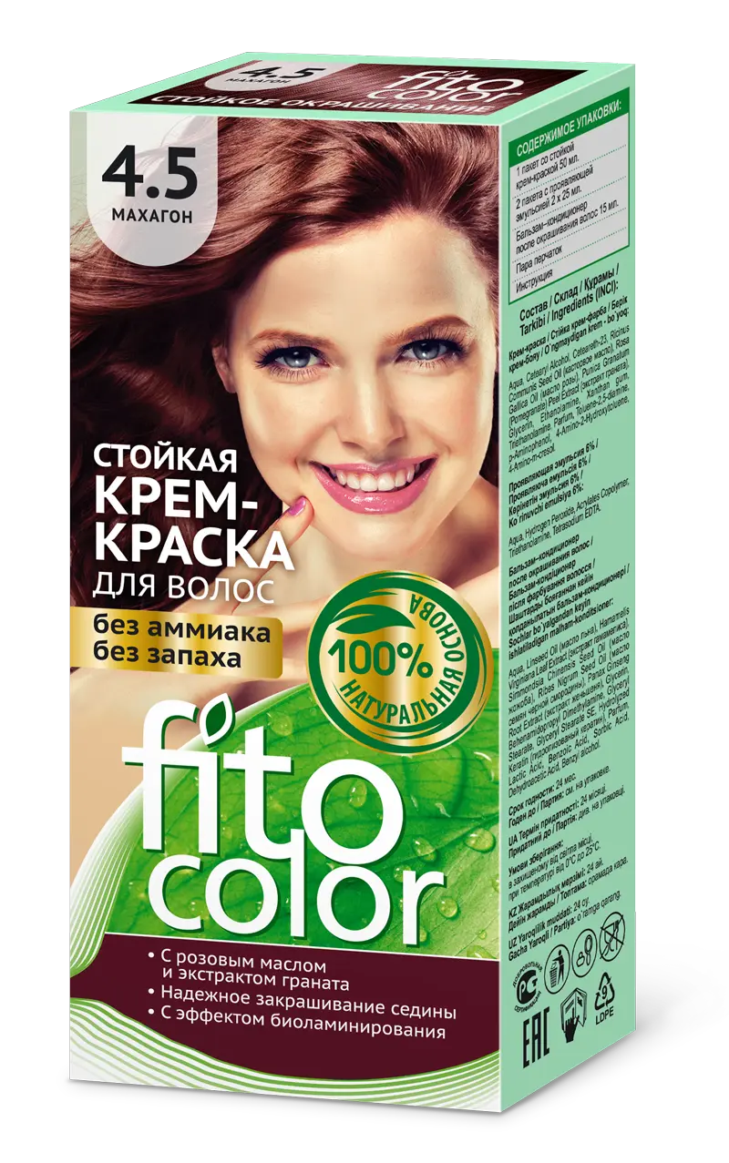 Стойкая крем-краска для волос (цвет махагон) FitoColor- природная красота для Ваших волос! Единственная крем-краска, разработанная на основе натуральных природных компонентов! Нежная кремовая текстура краски, обволакивая каждый волос, глубоко проникает в его структуру и окрашивает в сочные, объемные, яркие, цвета. Краска (цвет махагон) идеально закрашивает седину! Входящие в состав натуральные масла и экстракты растений питают, укрепляют и восстанавливают локоны, придают им гладкость, эластичность и объем.