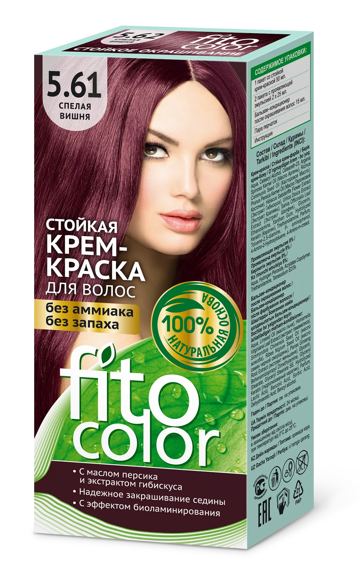 Стойкая крем-краска для волос FitoColor- природная красота для Ваших волос! Единственная крем-краска, разработанная на основе натуральных природных компонентов! Нежная кремовая текстура краски, обволакивая каждый волос, глубоко проникает в его структуру и окрашивает в сочные, объемные, яркие, цвета. Крем-краска идеально закрашивает седину! Входящие в состав натуральные масла и экстракты растений питают, укрепляют и восстанавливают локоны, придают им гладкость, эластичность и объем. Цвет - 5.61 Спелая Вишня