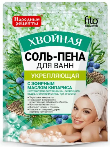 Укрепляющая соль-пена с натуральными экстрактами хвойных деревьев обладает мощными терапевтическими и косметическими действиями: питает и увлажняет кожу, выводит шлаки и токсины, улучшает состояние кожи, восстанавливает защитные функции организма, а также укрепляет нервную систему. Эфирное масло кипариса окутает вас лёгким приятным ароматом, вы почувствуете прилив сил и энергии. Насладитесь всей пользой хвойной терапии, не выходя из дома!