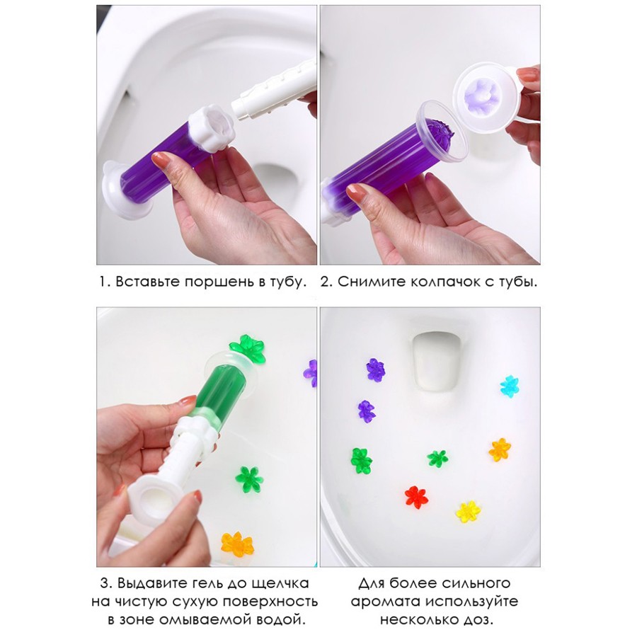 Способ применения:1. Вставьте поршень в тубу.2. Снимите колпачок с тубы.3. Нанесите средство на чистую сухую поверхность унитаза в зоне омываемой водой нажатием на поршень до щелчка. Сильно давить не нужно! Достаточно не сильного нажатия . Диск плотно прилипнет к поверхности.озатор в форме цветочков