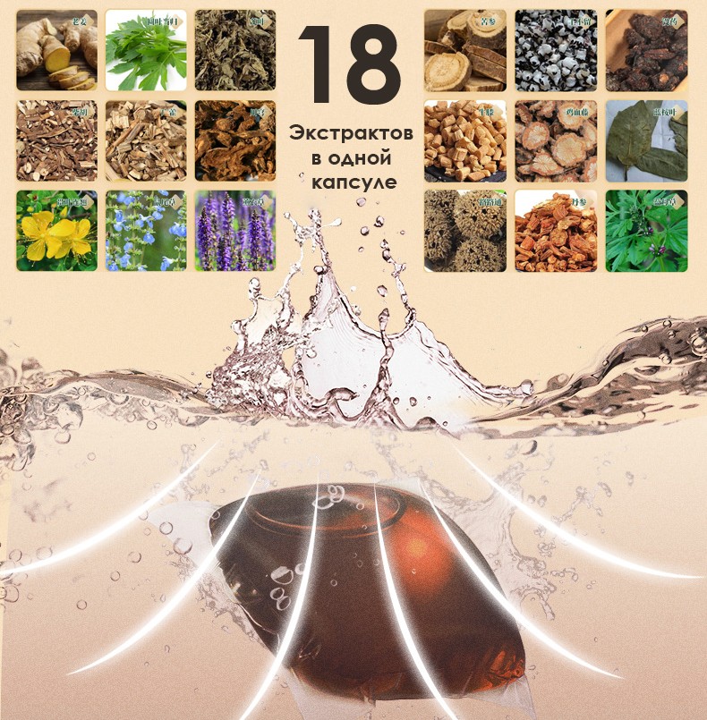 Травы и коренья, входящие в состав: имбирь, зверобой, мудрец, лаванда, софора, мирра, эвкалипт, спатолобус, пустырник, сальвия, паспарту и другие.