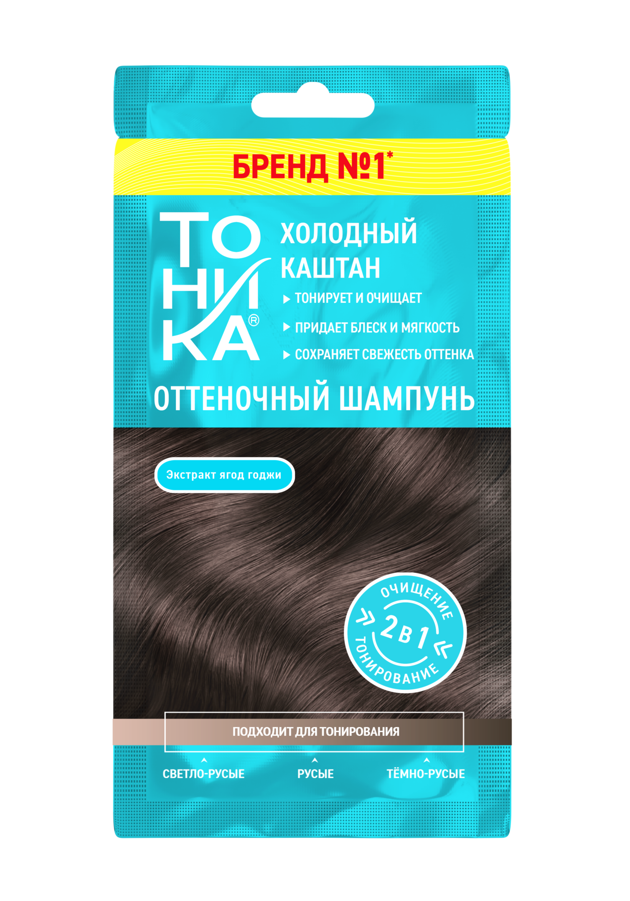 Элегантный и утончённый, холодный каштановый оттенок дарит волосам глубокий, насыщенный темно коричневый цвет с лёгким холодным подтоном. Подарите своим волосам идеальный уход с новыми оттеночными шампунями Тоника! Мягкое очищение, деликатное тонирование и интенсивное питание в одном компактном саше. Шампунь не только придает волосам гладкость и легкость в расчесывании, но и сохраняет яркость цвета до 4 раз мытья головы. Уникальная формула с экстрактом ягод годжи, протеинами шелка и пантенолом укрепляет, увлажняет и восстанавливает волосы, делая их сияющими и здоровыми.