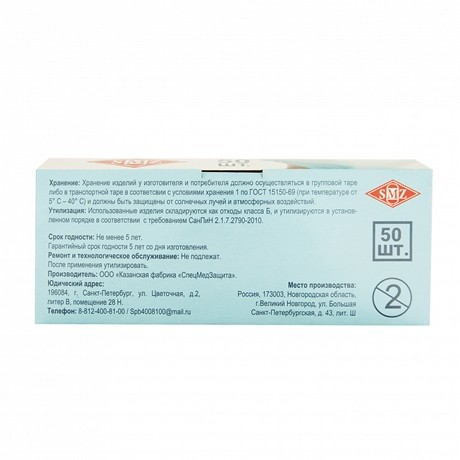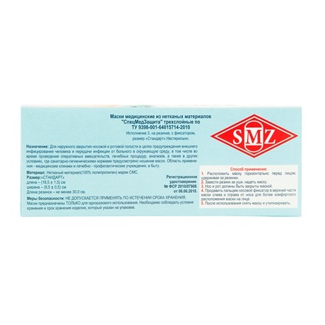 Маски одноразовые медицинские 3-х слойные СпецМедЗащита, набор 50 штук. (Россия)