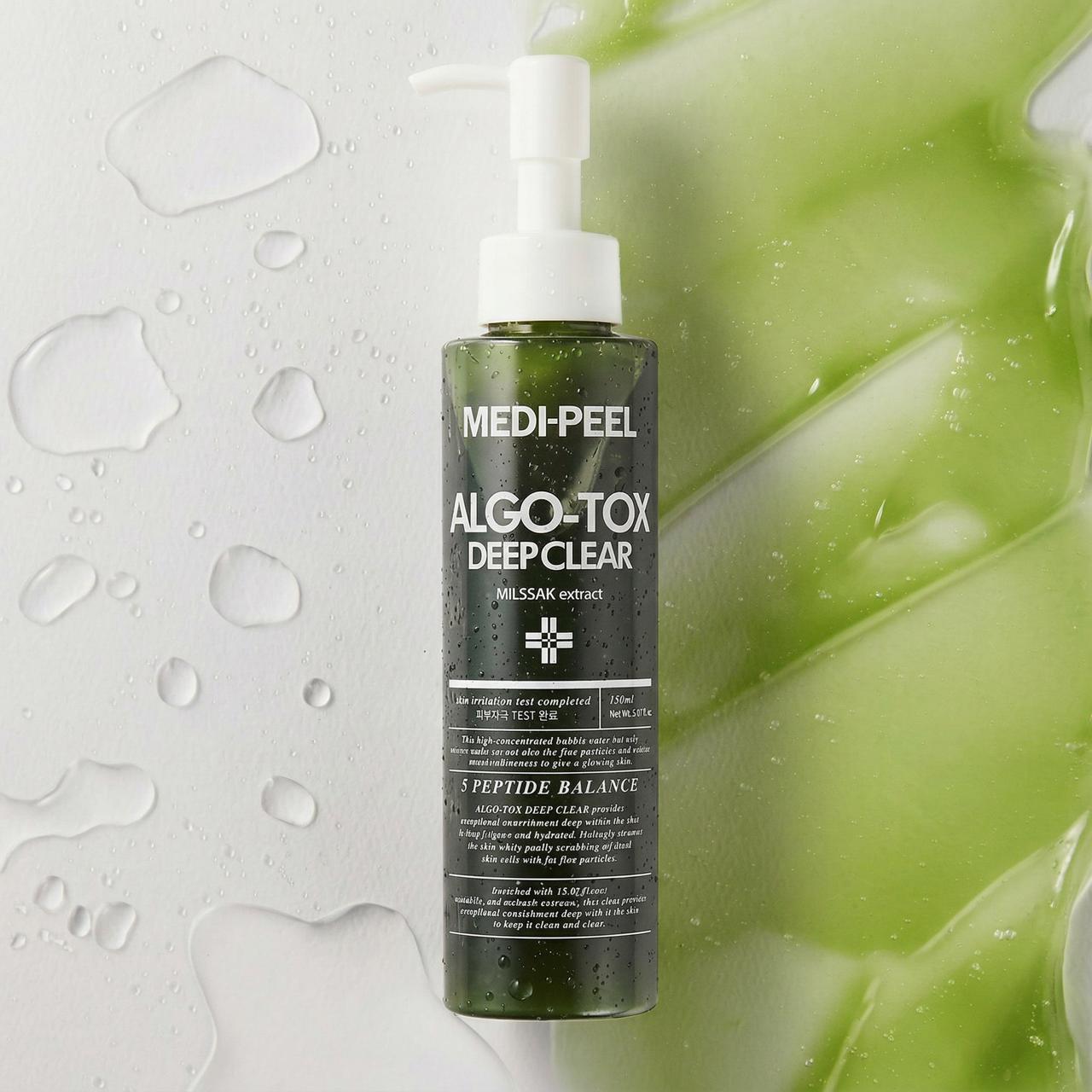 MEDI-PEEL ALGO-TOX DEEP CLEAR (150ml) - эффективно растворяет все виды загрязнений, стойкую косметику и тональные средства, растворяет жировые пробки и очищает поры. Комплекс из натуральных растительных компонентов оздоравливает и тонизирует кожу и обладает высокой антиоксидантной активностью. Средство поддерживает оптимальный уровень увлажнения, успокаивает раздражённую кожу и снижает риск появления воспалений. Улучшает общий цвет лица и повышает иммунитет кожи.
