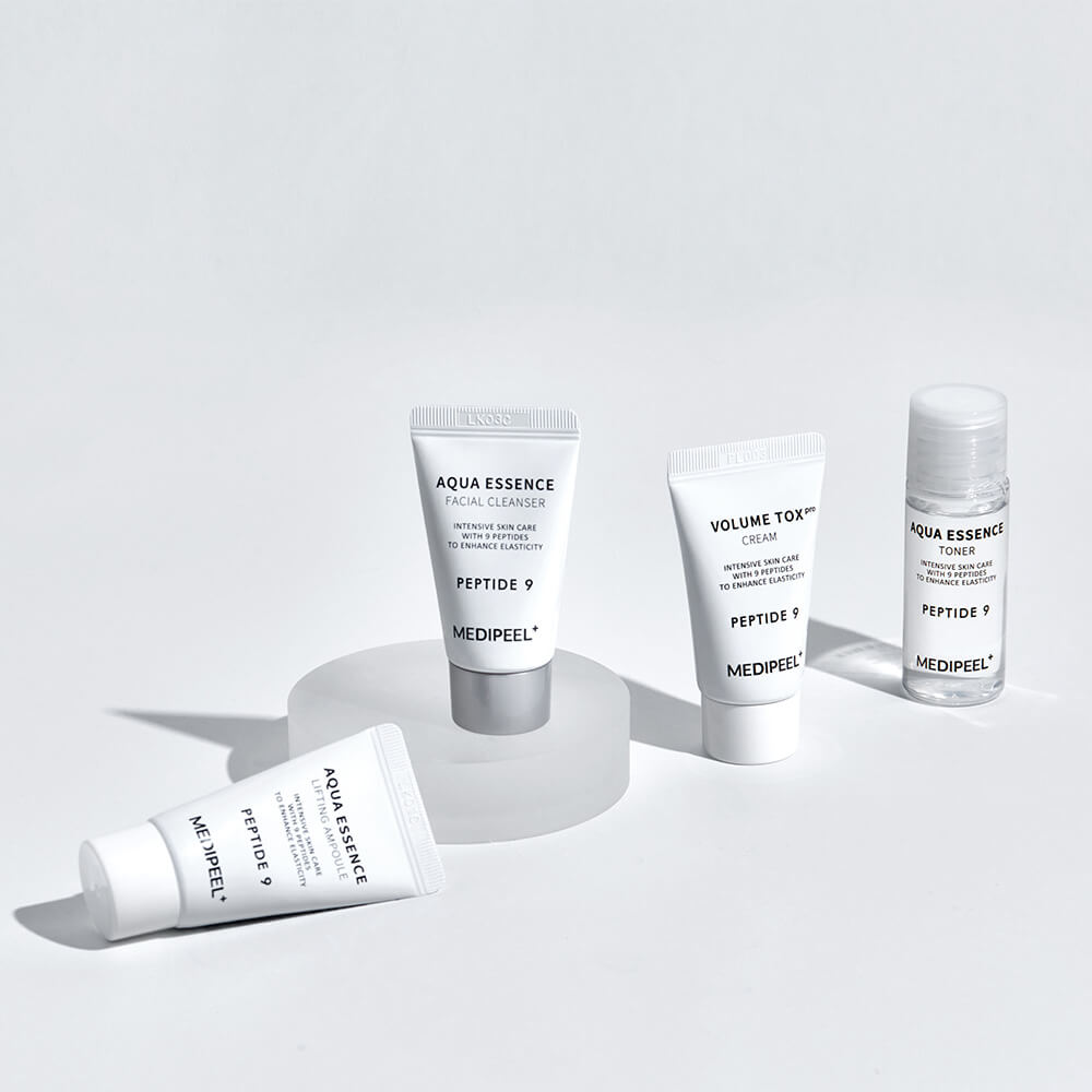 Антиоксидантный набор миниатюр с эффектом лифтинга MEDIPEEL Peptide 9 Aqua Essence Trial Kit работает на общее укрепление и оздоровление кожи, избавляет от тусклости, выравнивает тон и улучшает цвет лица. Эффективно выводит токсины, замедляет процессы старения и блокирует действие свободных радикалов, которые разрушают коллагеновые волокна.