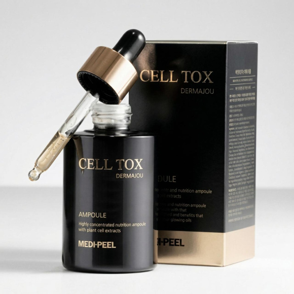 MEDI-PEEL CELL TOX DERMAJOU AMPOULE (100ml) - омолаживающий ампульная сыворотка со стволовыми клетками, пептидным и растительным комплексами, направленно работает на омолаживание кожи, оказывает интенсивный анти-эйдж эффект и максимальное увлажнение. Средство, проникая в глубокие слои эпидермиса, способствуют разглаживанию морщин, выравниванию поверхности кожи, восстановлению ее сияния и энергии, возвращает коже упругость и эластичность. Ампульная сыворотка интенсивно питает и увлажняет покров кожи, также осветляет и улучшает общий тон лица. Стволовые клетки (Дамасской розы и Белой лилии) способны активизировать Аквапорины, "водные каналы" в клеточных мембранах, создают защитную плёнку на поверхности кожи препятствуя испарению влаги, обеспечивают длительное увлажнение, а так же восстановление защитных функций эпидермиса.