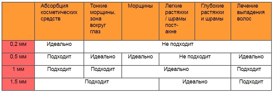 Посмотрите таблицу в фотографиях, на ней показано как определенная длина игл справляется с той или иной проблемой. Также следует учитывать, что чем толще кожа тем длинее может использоваться иглы. Например, для работы по  телу выбирайте иглы 1 мм, а для деликатных участков, таких как лицо, - 0,5 мм.
