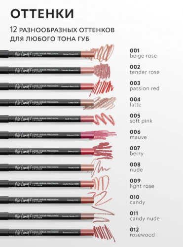 Long-wear precision от Monic beauty (Моник бьюти) гарантия совершенного результата для создания идеального контура губ и стойкого макияжа. Его кремовая текстура обеспечивает легкое скольжение и безупречное нанесение, позволяя добиться четких линий и насыщенного цвета с минимальными усилиями. Благодаря высокопигментированной формуле, карандаш обеспечивает стойкость цвета в течение дня, не вызывая дискомфорта и ощущения сухости. Универсальный оттенок создан для того, чтобы гармонично сочетаться с любым вашим настроением. No Limit! – это ваш надежный помощник для создания выразительного и ухоженного макияжа губ, подчеркивающий вашу индивидуальность.