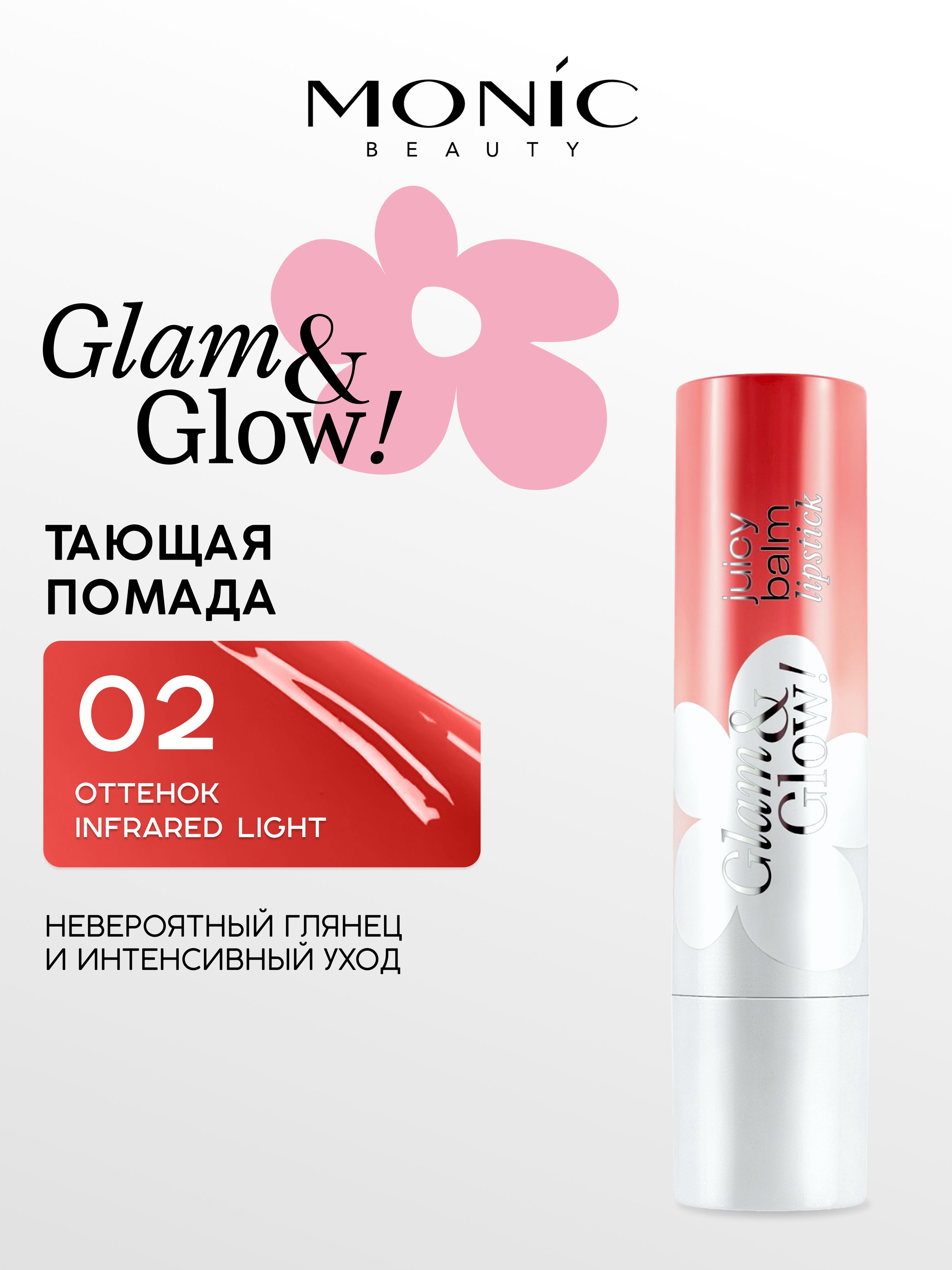 Тающая помада MONIC BEAUTY (Моник Бьюти) Glam&Glow! Juicy lip balm - это уникальное средство для макияжа, которое сочетает в себе блеск и увлажнение. Тающая помада обеспечивает интенсивное питание и увлажнение, защищает и восстанавливает кожу губ, придавая нежный оттенок. Невесомая шелковистая текстура очень комфортна в использовании, она легко и равномерно распределяется по коже губ, заполняя мелкие морщинки и неровности, делая губы мягкими и ухоженными. Масло семян подсолнечника обладает антиоксидантным действием, восстанавливает и защищает нежную кожу губ.